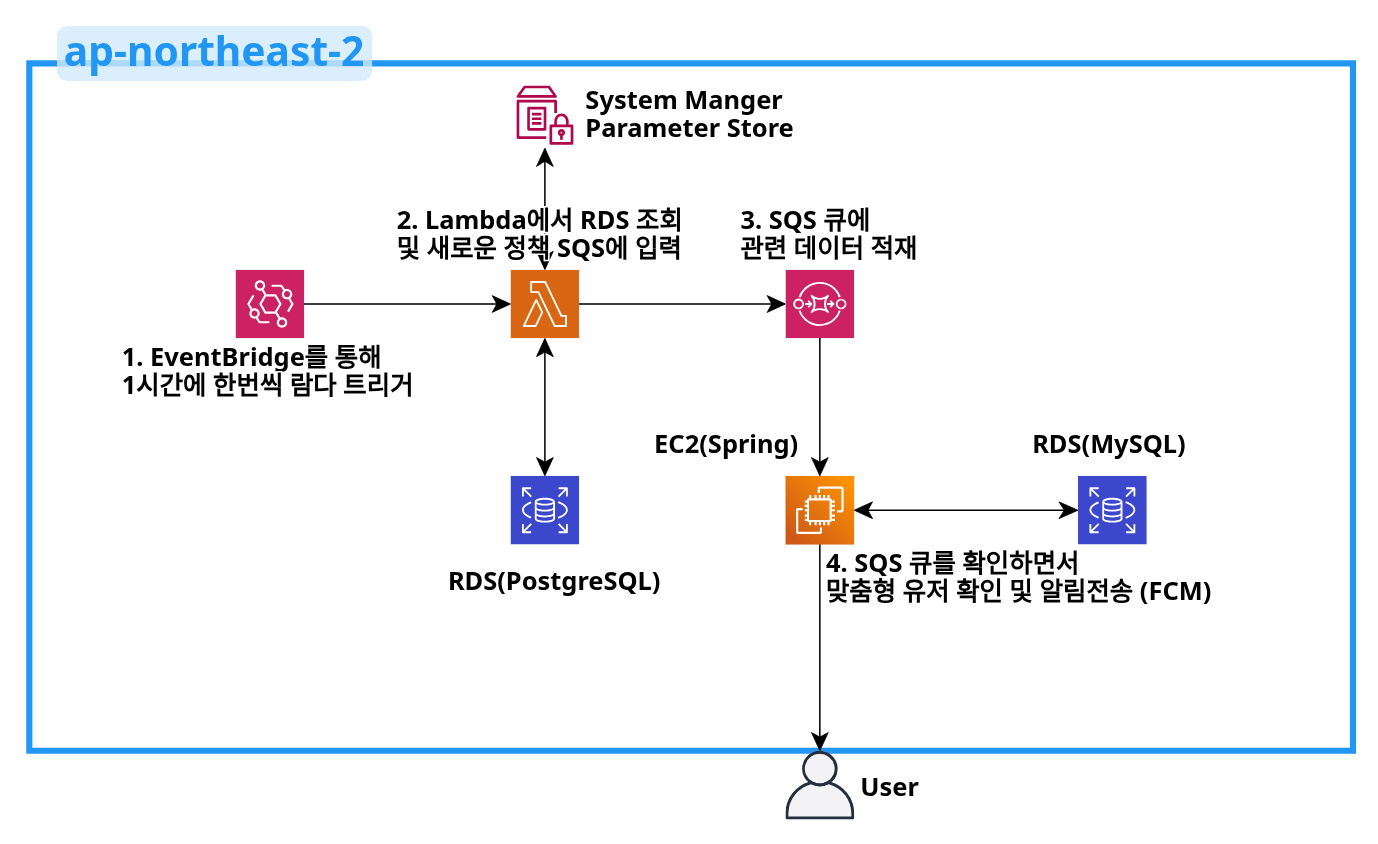 따라서, Lambda는 신규 정책 조회 및 해당 정책을 SQS에 메시지로 전달하는 단순 기능으로 구현하고, Spring 서버에서 SQS에 있는 메시지를 수신하여 처리하는 비즈니스 로직을 담당하는 것으로 결정하였다.